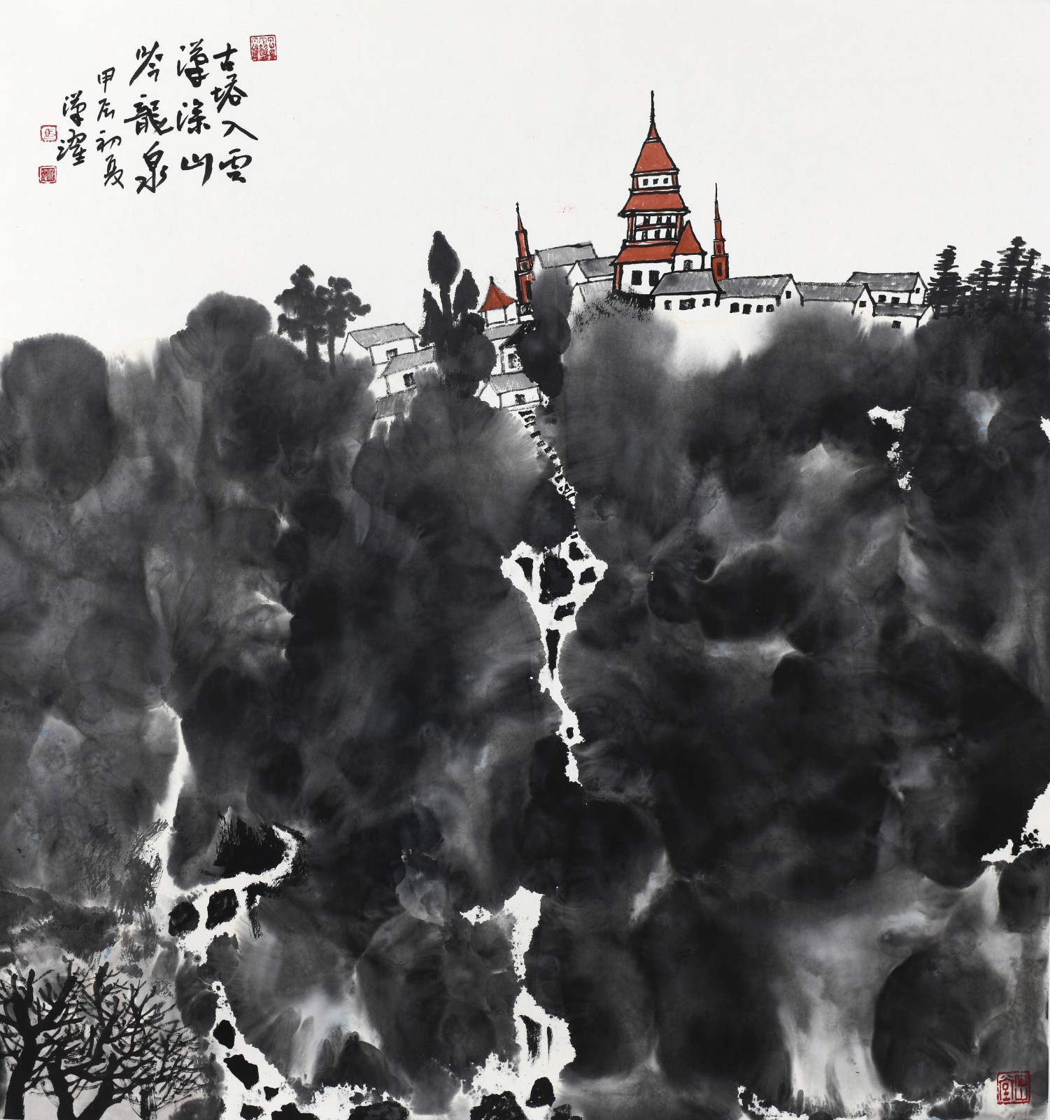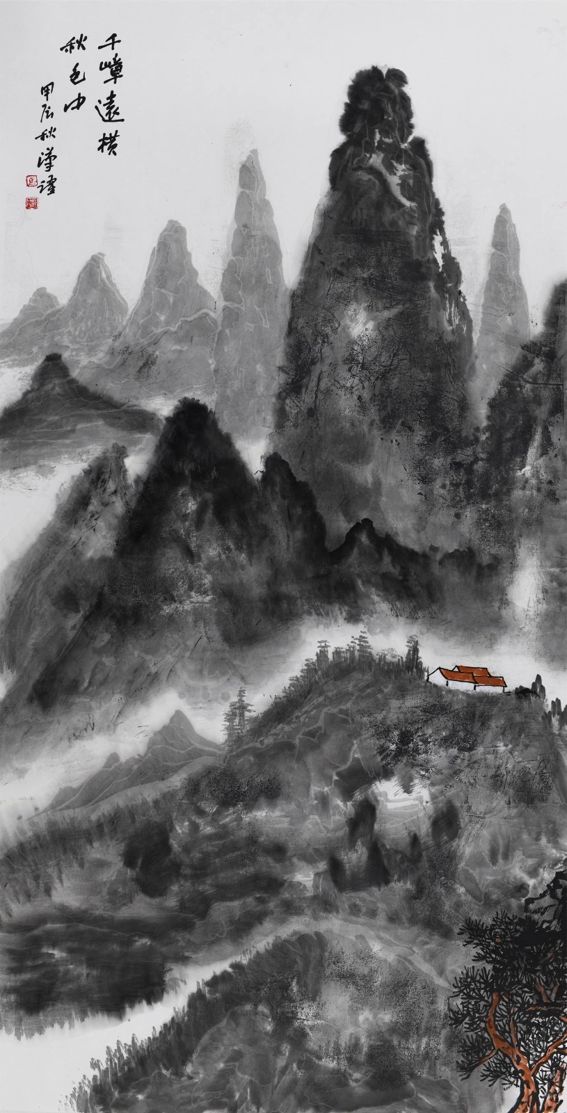 他对墨法的驾驭更见生命智慧。浓墨处如老柏覆霜,厚重得能承载千年岁月;淡墨处似晨烟漫谷,轻盈得可随风入画。枯笔飞白时,留有山石风化的斑驳肌理,像老者脸上的皱纹诉说着沧桑;泼墨晕染处,又显露出草木萌发的润朗生机,如春雨初歇后的新绿破土。这种 "墨分五色" 的变化,不是技巧的炫示,而是对自然生命从枯荣到盛衰的精准摹写 —— 正如天地间没有永恒的枯寂,也没有不变的繁盛,笔墨的浓淡转换,正是生命循环的隐喻。