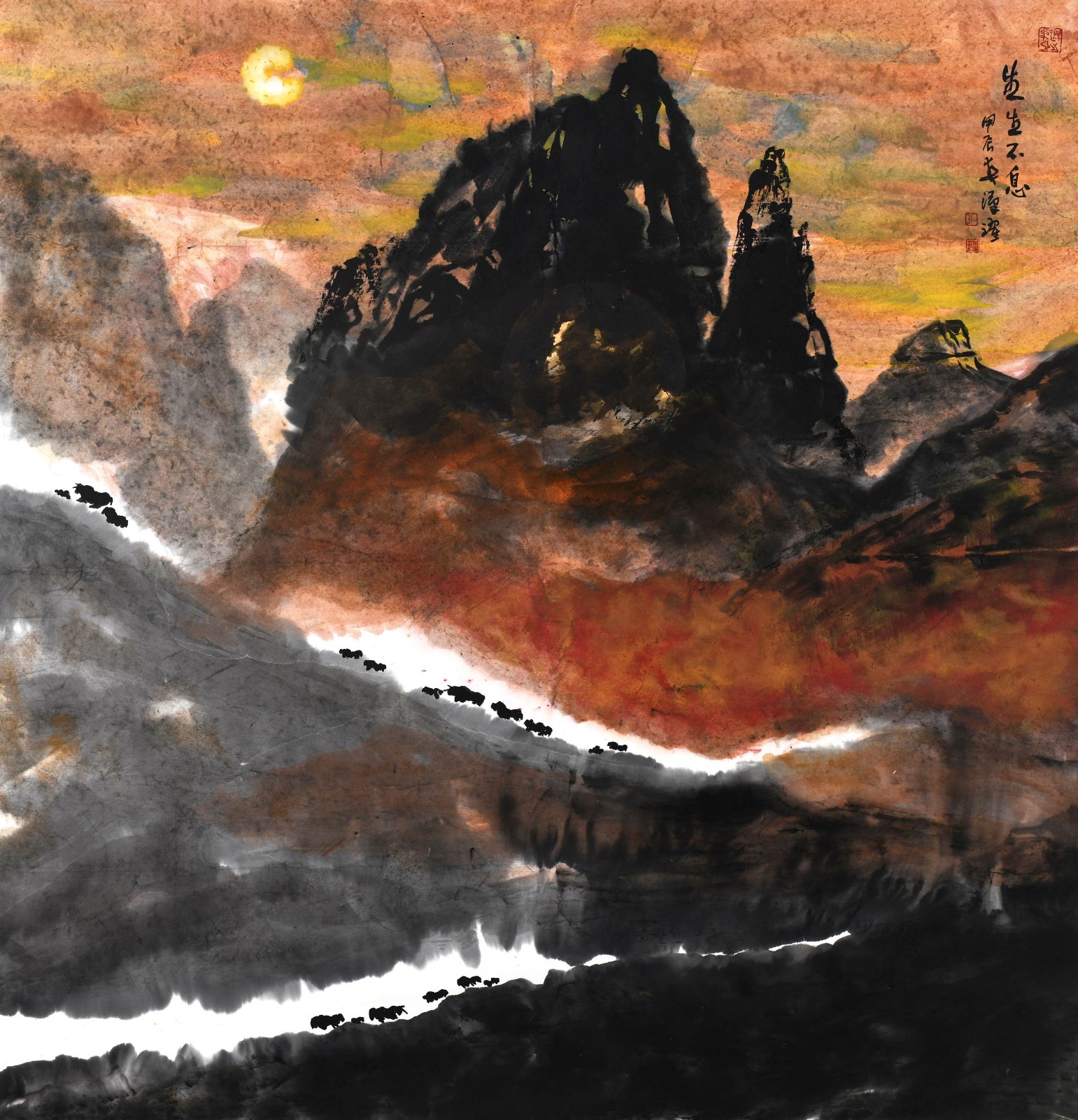 在马汉跃的山水构图中,丘壑的开合藏露间,藏着生命场域的运行法则。他的大幅作品如《日出尼山》,山峦层叠如波涛起伏,主峰巍峨如华盖擎天,次峰拱卫似群臣朝贺,开合之间暗合 "太极生两仪" 的宇宙秩序。前景的苍松扎根岩隙,中景的村落炊烟袅袅,远景的云海浩渺无际,从精微到宏阔,恰似生命从个体到群体的延展,每一处细节都在整体格局中获得存在的意义。