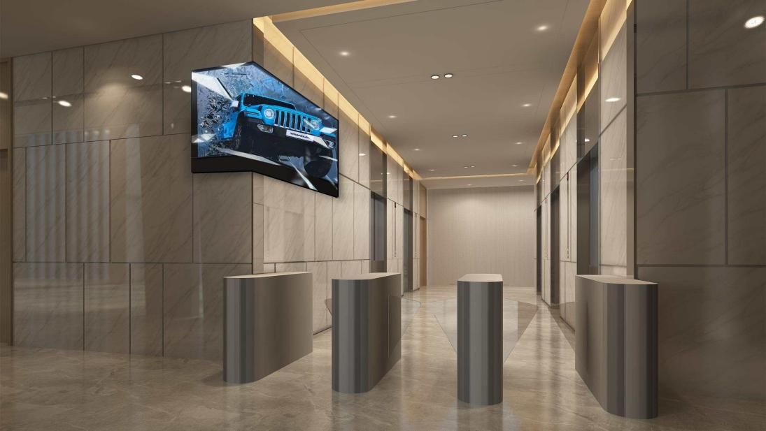 同时,创视科技通过90度折角屏营造裸眼三维创意空间, 折角屏精准部署于写字楼梯厅打卡机入口,两面直角屏分别覆盖大厅与电梯等候厅核心动线。既可分屏呈现 “海报 + 视频” 组合物料,又能解锁裸眼 3D 创意效果,将成都太古里爆火的趣味三维体验搬进职场,让打工人日常触达沉浸式视觉惊喜。对品牌,强化广告视觉吸引力,提升记忆点;对物业,升级写字楼环境质感,以创新屏显重塑梯厅空间的传播与美学双重价值。